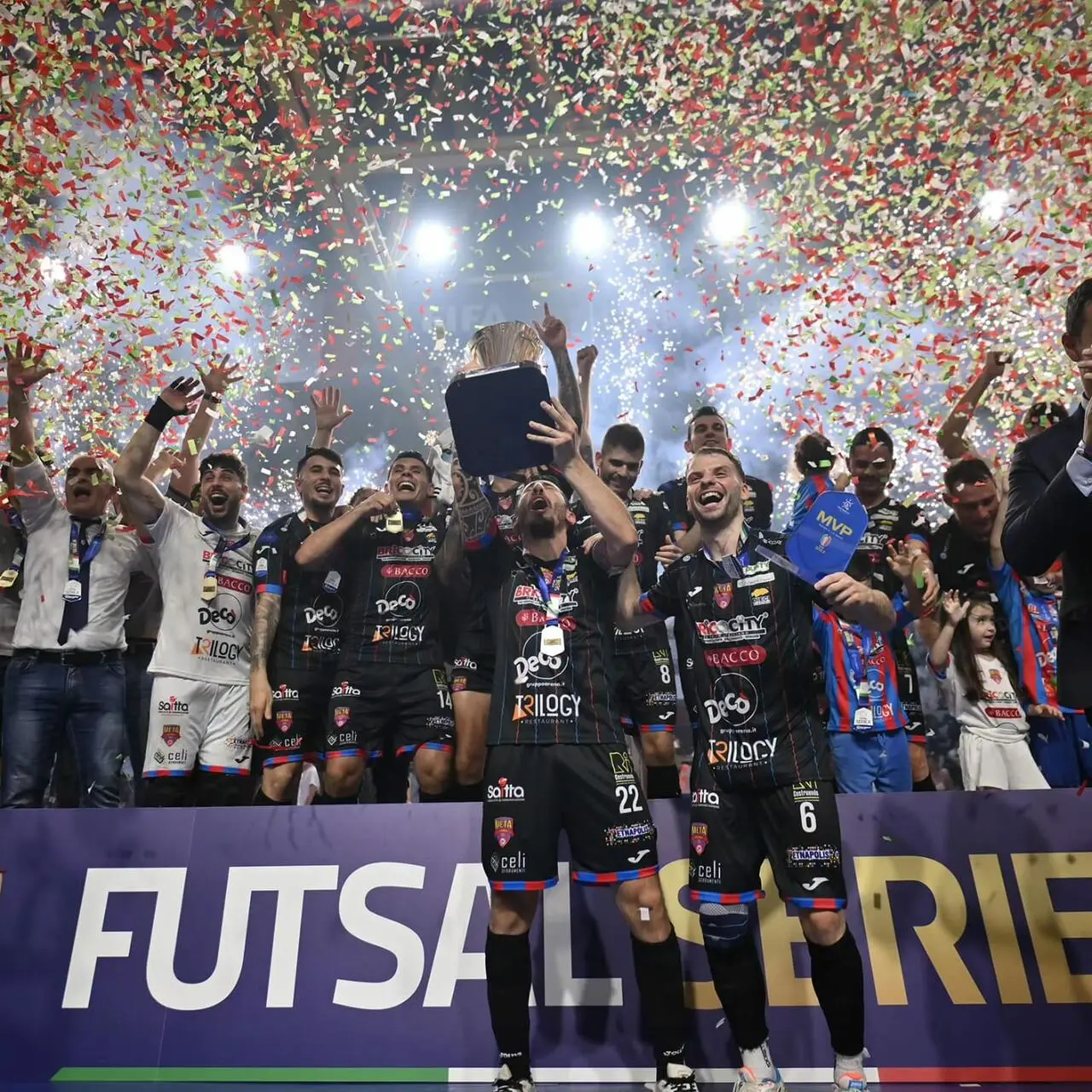 La sirena è un suono pazzesco, ed è una musica soave dove il canto dei tifosi rossazzurri si mischia alla gioia infinita dei ragazzi di Juanra. La Meta Catania entra nella storia, porta il primo grande scudetto siciliano nel futsal. La quarantesima edizione del campionato porta i colori rossazzurri, un tricolore di una squadra-famiglia fantastica che passo dopo passo ha costruito la sua forza. Lo scudetto della colonna Carmelo Musumeci, dei catanesi Giovanni Pulvirenti, Seby Tornatore e Maurizio Silvestri, lo scudetto di un bomber consacrato come Podda, di uomini simbolo e decisivi come Bocao, Turmena, Dian Luka, Timm senza dimenticare i sempre pronti e sette polmoni firmati Salamone, Anderson. Una gioia immensa per un presidente Enrico Musumeci che raccoglie i frutti di programmazione e passione di una società cresciuta in maniera pazzesca anno dopo anno. Lo scudetto della bolgia del PalaCatania, lo scudetto per Catania e per i catanesi. Catanesi campioni d'Italia. Una magia unica che vola sulle note del grande Battiato, perché oggi gira tutta la stanza come si balla, canta…canta Meta Catania sei Campione d’Italia.