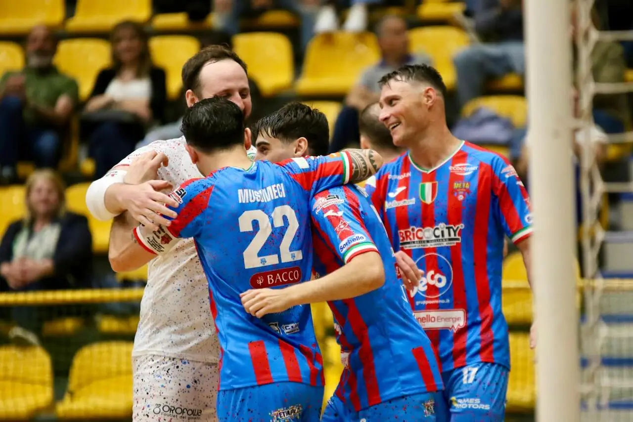 Nella ripresa la musica non cambiava: Meta Catania dominante e vicina al terzo gol dopo l’espulsione di Grasso. Rete che veniva firmata da Michele Podda su ottima giocata tutta di prima dei rossazzurri. Active Network che provava il portiere di movimento ma la fase difensiva degli uomini di Juanra era perfetta. Su una di queste pizzicate ecco Carmelo Musumeci che firmava lasciando sul posto Cesaroni la rete del 4-1 mettendo il sigillo ad un’altra super prestazione del capitano. La sirena della vittoria parla di un PalaCatania imbattuto della 21° vittoria in campionato e di un primato ancora distante tre punti con una gara da giocare. Una Meta Catania solida, forte e spietata che si appresta a chiudere il campionato in grande salute.